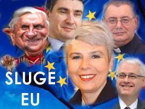 No, nije uopće iznenađujuće što je Rimska crkva spremna tako žestoko „lobirati“ za Europsku uniju, što je pripravna čak i hrvatski narod optužiti za jugounitarizam i želju za pripajanjem nekakvim balkanskim asocijacijama ako se počne suprotstavljati „svetom povijesnom cilju“ sveukupne hrvatske političko-crkvene oligarhije. Očito je cilj hrvatske političke oligarhije i cilj „svete majke crkve“ jedan te isti. Rimokatolička crkva razobličuje ovim potezom samu sebe. Činjenica da se kada su u pitanju ovi prostori ta vjerska zajednica intenzivno bavi geostrategijom (namjesto, recimo, evanđeljem), već je sama po sebi dovoljna da se čovjek upita o njenoj pravoj ulozi. A svojim bezrezervnim zagovaranjem pristupanja čitavog Balkana u diktatorsku briselsku EU-federaciju (što je njen „Pontifex Maximus“ jasno iznio u razgovoru s unionistom Josipovićem prošlog listopada), osudom svakom kritičkog mišljenja, a u zadnje vrijeme i osudom kritičkog mišljenja u odnosu na Europsku uniju, — ta crkva najbolje sama razotkriva svoje istinske namjere, koje su sve samo ne vjerske prirode. Tko ima oči neka vidi. Je li Benediktov bog i vaš Bog? Prije ili kasnije, morat ćete odlučiti.