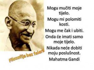 ugnjetavanju, ali nipošto ne smijemo nanositi zlo ugnjetaču. Njega moramo pobijediti ljubavlju – otkazati mu poslušnost, makar po cijenu života…. Građanska neposlušnost je urođeno pravo svakog građanina. Ukoliko je se odrekne, on prestaje biti čovjek…. Najveća snaga kojom raspolaže čovječanstvo jest nenasilje. Ono je jače i od najmoćnijega razornog oružja što ga je stvorio ljudski um….”. Mahatma Gandhi