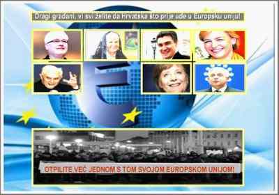 Eurozona umire. A eurozona je sama bît Europske unije. Unatoč tome, udružena hrvatska unionistička oligarhijska vrhuška koja ionako nema nikakvu drugu politiku osim utrpavanja Hrvatske u Europsku uniju počela je s provedbom žestoke indoktrinacijske kampanje usmjerene prema unioskeptično orijentiranim hrvatskim građanima. Emitirat će čak tisuću spotova kojima će nam pokušati isprati mozgove. Hoće li uspjeti?